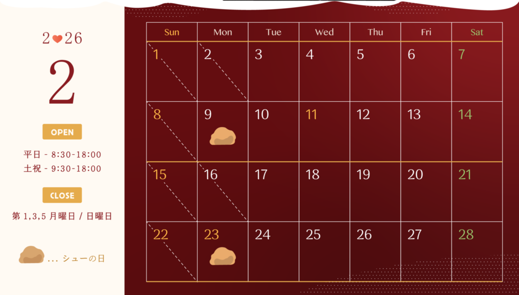 OPEN 平日:8:30-18:00 土祝:9:30-18:00 定休日:第1,3,5月曜日/日曜日