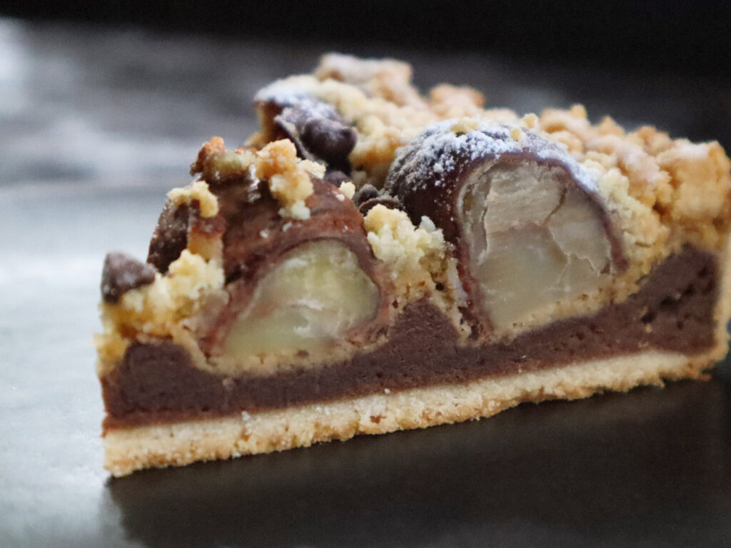 栗とチョコレートのアパレイユ生地とヘーゼルナッツをたっぷりと使ったダマンド生地をザクザクのタルト生地に重ね、丁寧に下処理した丹波栗の渋皮煮をたっぷり乗せてじっくり焼き上げました。