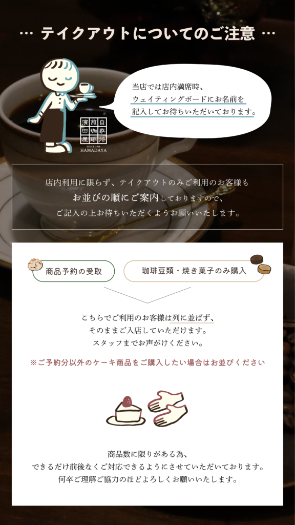 予約商品の受け取り、または珈琲豆や焼き菓子のみご購入のお客様は列に並ばず、そのままご入店いただけます。